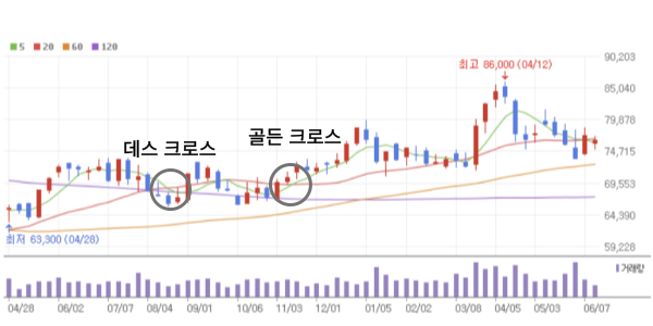 단기 이동평균선이 장기 이동평균선을 상향 돌파하는 경우를 골든 크로스, 하락 돌파할 때를 데스 크로스라 부릅니다. 골든 크로스는 주가가 상승할 여력이 있는 신호로 간주되는 반면 데스 크로스는 가력 하락 가능성이 있음을 의미합니다. 이때 거래량이 높다면 신호의 유효성이 더욱 강화됩니다.